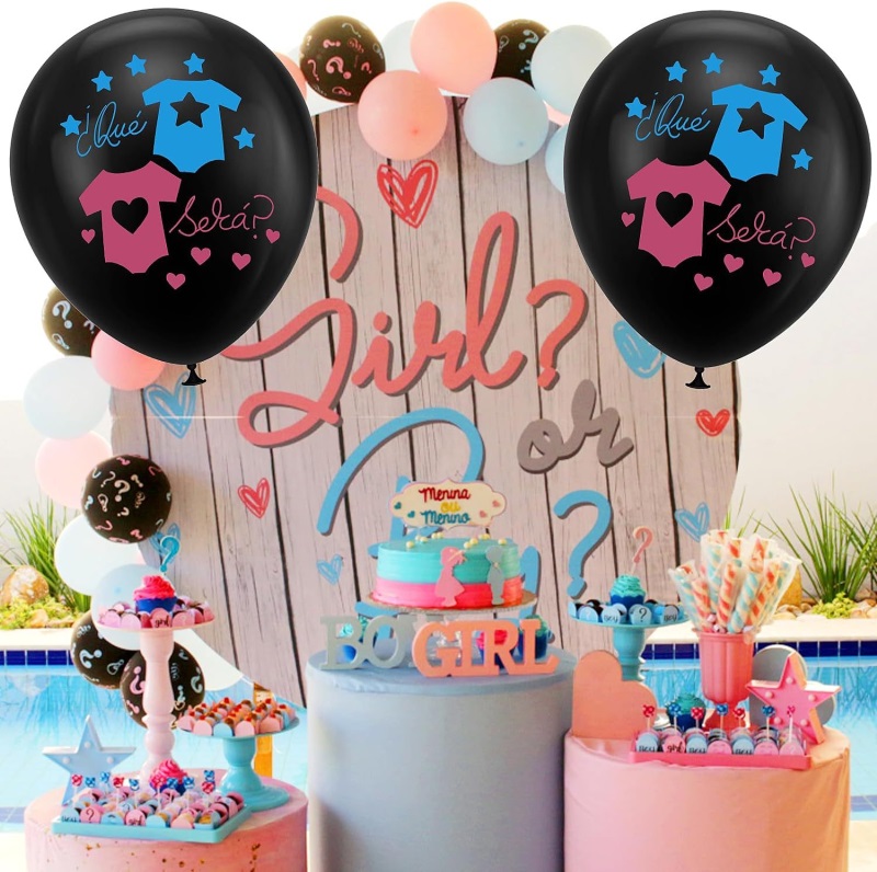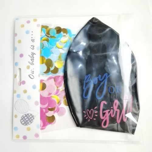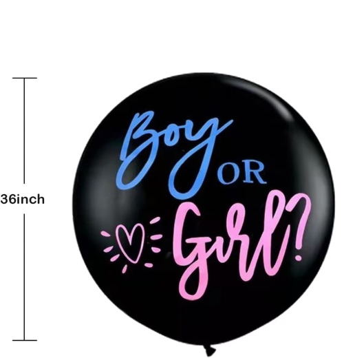 Za36-palčni balon za razkrivanje spolana zalogi je mat črne barve in ima veliko stilov tiskanja, na primer deček ali deklica, slika fanta in deklice ali nekaj drugega, kar je povezano s fantom in deklico. Za konfete so ena vrečka roza papirnati konfeti s konfeti iz folije zlate barve, druga vrečka pa so modri papirnati konfeti s konfeti iz folije zlate barve.