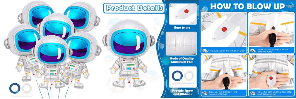Obstajajo običajne astronavtske polne oblike telesa, ki prikazujejo podobo astronavtov v vesoljski obleki, nekateri slogi s podstavkom, napihljivi lahko stojijo. Na voljo so različne velikosti, kot so 18 inčev, 24 inčev, 28 inčev itd., pa tudi nekaj večjih balonov, kot so stoječi astronavtski folijasti baloni višine 65 cm. Uporablja se predvsem za rojstnodnevne zabave z vesoljsko tematiko, zabave za dobrodošlico dojenčkom, dekoracijo otroške sobe in druge priložnosti, ki lahko dogodku dodajo veselo vesoljsko vzdušje.