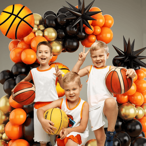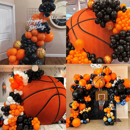 Košarkarski balon girlanda je simbol športnega duha. Priloženih je več balonov iz lateksa in več balonov iz folije. Kot pri košarkarski temi sta barvi tega kompleta večinoma oranžna in črna, za izdelavo različnih plasti pakovinski zlati baloni iz lateksaso tudi dodani. Celoten slog je zelo privlačen in lahko takoj izboljša vzdušje vaše zabave.