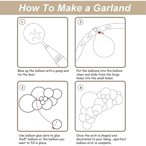 Pozor in opozorilo:Prosimo, NE napolnite balonov preveč in se izogibajte sončnim opeklinam, pregretju, koničastim predmetom in pretiranemu trenju. Nadzirajte količino zraka, napihnjenega v vsak balon, da dosežete svojo idealno velikost balona, uživajte v zabavi s kompleti Balloon Girlland Arch.