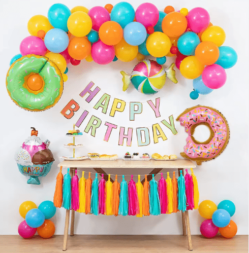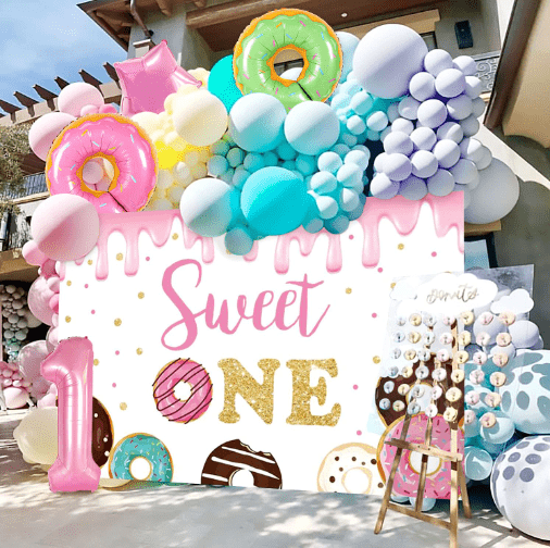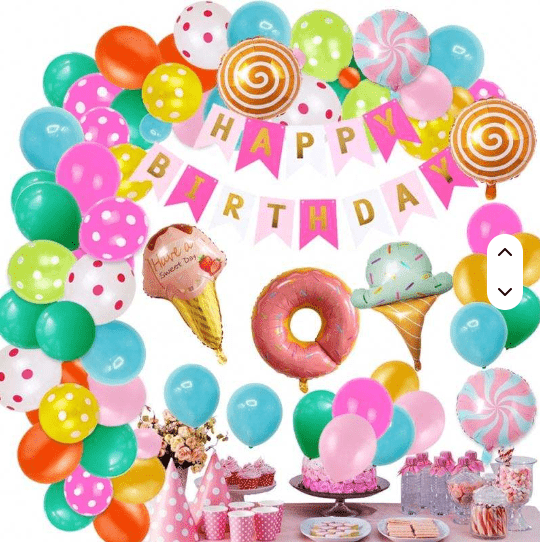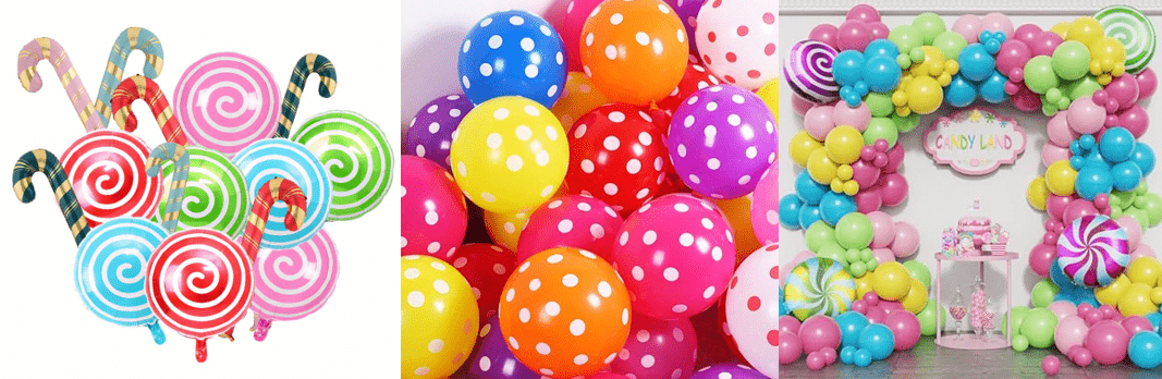 Komplet balonskih vencev na temo bonbonov z barvo bonbonov sladkih sanj in ljubko obliko lizike kot osrednjimi elementi oblikovanja, celoten slog je živahen in sladek.
