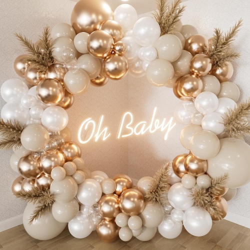 Ta balonski lok v barvi šampanjca je skrbno okrašen zbaloni iz lateksav velikostih 5 palcev, 10 palcev in 12 palcev. Različne velikosti so lepo razporejene skupaj in ustvarjajo prijeten tridimenzionalni učinek. Tako je celoten lok videti poln in kvaliteten. Nežna barva šampanjca mu daje eleganten sijaj, s svojo preprosto in elegantno obliko pa ustvarja eleganten in romantičen pridih. Popoln je za razkošne zabave, poroke ali dogodke in izgleda odlično kot osrednji del.