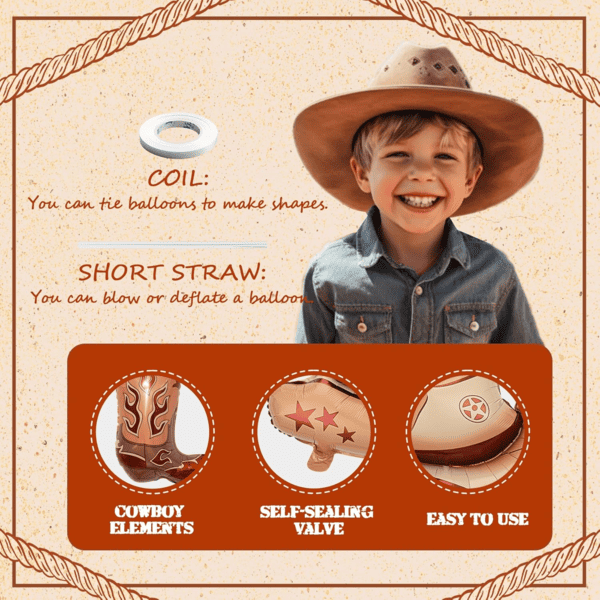 Komplet vencev iz kavbojskih balonov iz folije:Glavna značilnost tega kompleta girland iz balonov so baloni iz folije v galopu, ki lebdijo v zraku. Lahko jih pritrdite s pikčastim lepilom in trakom, da ustvarite ta učinek. Poleg tega dodajte balone iz folije s kavbojskimi klobuki in baloni iz folije s kavbojskimi škornji bodo dobra kombinacija. Glavno telo kompleta je sestavljeno iz balonov iz lateksa z dizajnom v zahodnem slogu. Na voljo je približno 60-80 kosov balonov različnih velikosti, vključno z rjavimi, črnimi ter črno-belimi kravjimi itd.