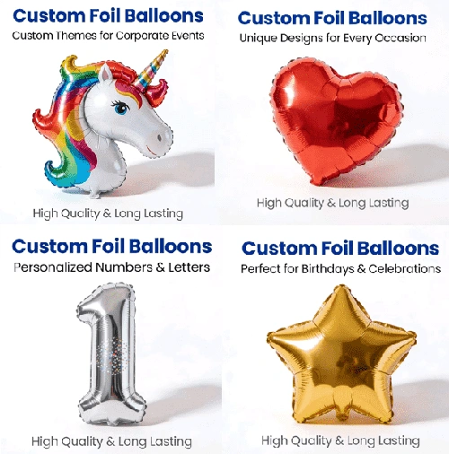Prilagojene balone iz folije je mogoče prilagoditi v običajnih velikostih, vključno s 5, 10, 18, 24 in 36 palci. Posebne nepravilne oblike in velikosti je mogoče prilagoditi tudi zahtevam.