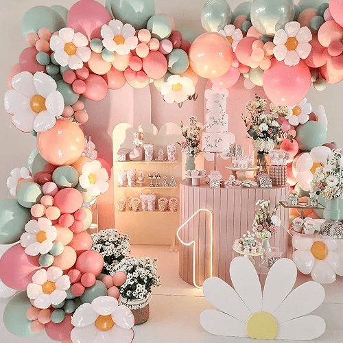 Rojstnodnevna zabava: Girlanda iz balonov marjetic se lahko uporablja kot dekoracija ozadja za rojstnodnevne zabave, primerna za aranžiranje na otroških ali ženskih rojstnodnevnih zabavah, ki ustvarjajo veselo vzdušje.