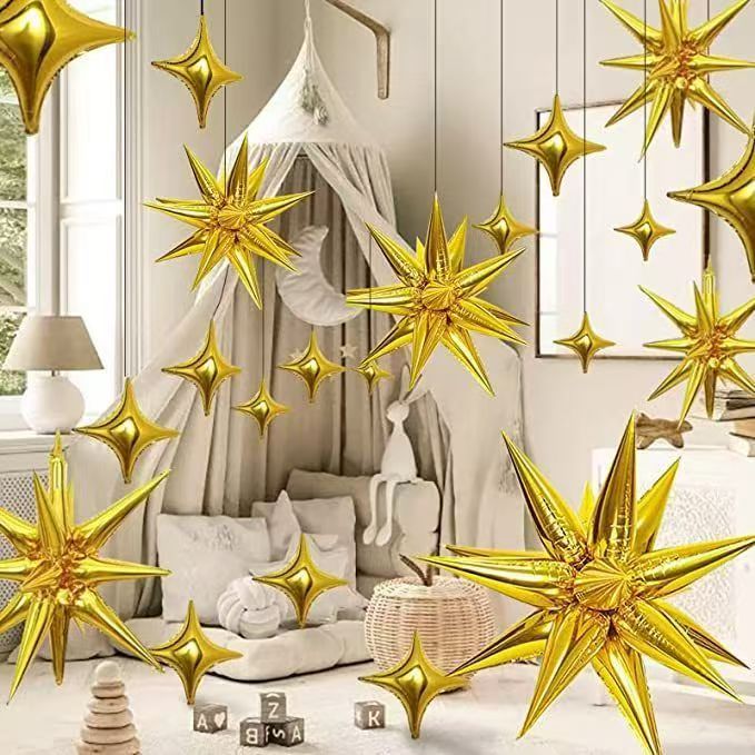 Eno-delni eksplodirajoči zvezdni folijski baloni: na voljo v dveh velikostih: 22 palcev in 27 palcev. 22-palčna velikost je manjša in primerna za spalnice in pisarne, zaradi česar je kot nalašč za dekor za rojstni dan. 27-palčna velikost je bolj primerna za večje prostore, kot so banketne dvorane in nakupovalna okna. Tudi če je obešen visoko, je vzorec jasno viden.