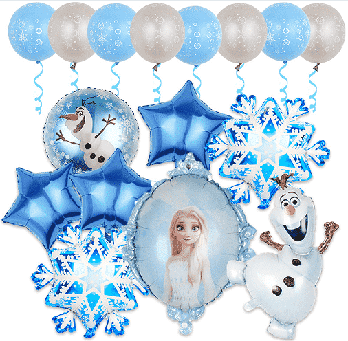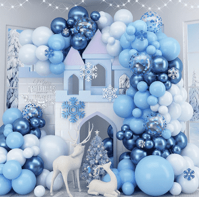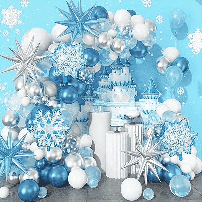 3.Kompleti girland iz zamrznjenih balonovobičajno vsebujejo različne velikostizamrznjeni baloni, unikatne balone iz folije, ujemajoče se okrasne trakove, napihovalce, neoznačene lepilne točke, vezice za namestitev in druge dodatke za izpolnitev zahtev glede postavitve na enem postanku. Vse komponente so izdelane iz varnih in okolju prijaznih materialov, popolnoma prilagojenih prizorom otroške dejavnosti. Balonasti vzorec v obleki je skrbno usklajen in združuje klasično karakterno podobo Frozen z zasanjanimi elementi ledu in snega. Barve so modra, bela in srebrna, ki ustvarjajo čisto in romantično čarobno vzdušje.