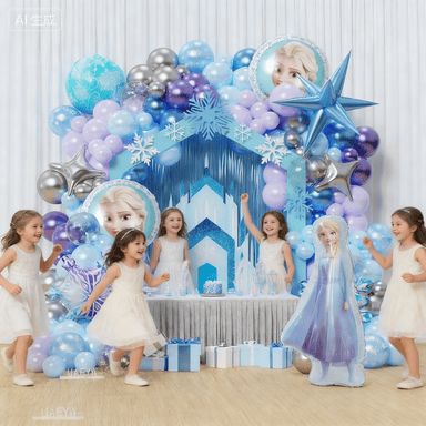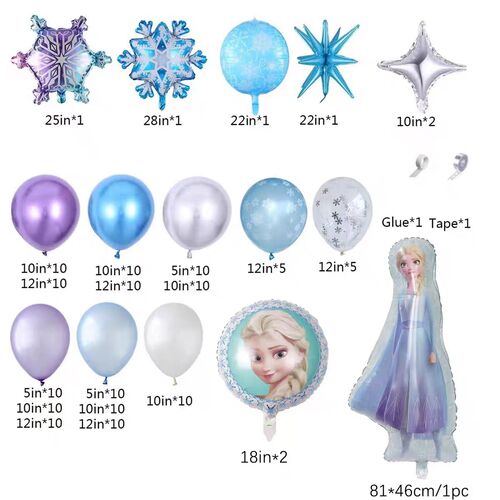 Baloni iz folije so glavni del kompleta lokov balonov na temo Frozen. Vključujejo predvsem balon iz folije s portretno glavo princese, balon iz folije snežaka. Balon iz folije s številkami in balon iz folije s črkami lahko dodate tudi za ustvarjanje boljšega vzdušja zabave, kot če želite dekoracijo v slogu rojstnodnevne zabave.
