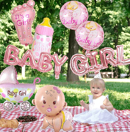 Osnovni komplet za balone se ujema predvsem z dvema glavnima barvama roza in modre, nekaj balonov za sekvence in črke aluminijastih balonov iste barve pa dodamo kot okras.