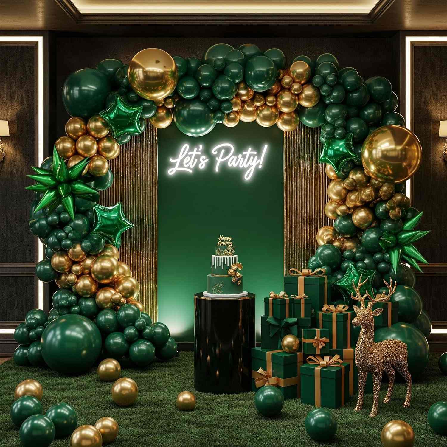 Zeleno-zlat balonski lok za zabavo je lahko glavni pogled na katero koli sceno. Dodaja teksturo in močan občutek slovesnosti. Kaže tako milino kot poseben okus.