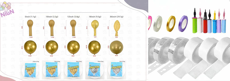 Komplet lokov ima 5-palčne, 10-palčne, 12-palčne, 18-palčne ali 36-palčne balone. Kombinacija teh različnih velikosti vam omogoča enostavno ustvarjanje balonskega loka s polnim in večplastnim videzom.