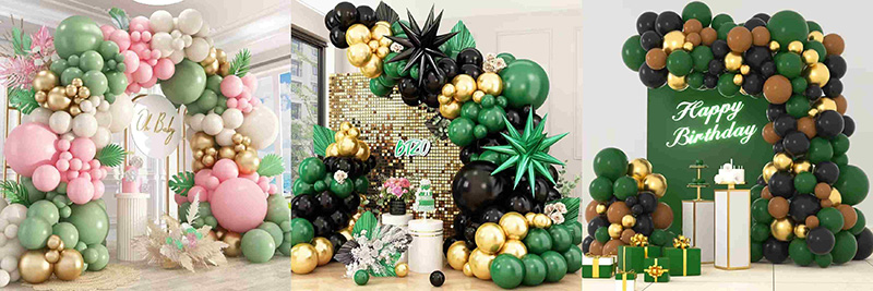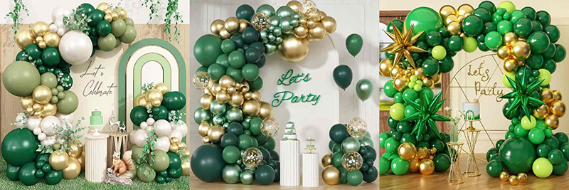 Uporabite lahko bele ali hruškasto bele balone z zelenim in zlatim balonskim lokom. Postal bo mehak in topel ter podoben ujetju svežine pomladnega vrta; v kombinaciji z rožnatimi baloni lahko ustvari živahen občutek, ki je sladek, ne da bi bil nadležen, kar vnese romantično vzdušje v otroške zabave in zabave z dekliško tematiko; tudi v kombinaciji z globljimi barvami, kot sta črna in rjava, lahko zelene in zlate barve uravnotežijo globino in stabilnost teh odtenkov s svojo osupljivo barvno napetostjo ter ustvarijo sodoben, a topel praznični ambient.