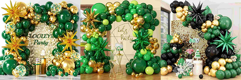 Zelenemu in zlatemu balonskemu loku lahko dodate balone iz folije z zlato zvezdo, balone iz folije z zeleno zvezdo ali druge oblike folije v isti barvi. To ohranja zeleno in zlato temo. Zaradi svetleče folije je videti bolj 3D in doda majhne svetle dele. Zlate zvezde so videti kot razpršena svetloba zvezd, zelene zvezde pa se razprostirajo kot listi. Lok se spremeni iz ravnih barv v teksturirano, oblikovano umetniško delo. Z lahkoto postane privlačen poudarek prizorišča.