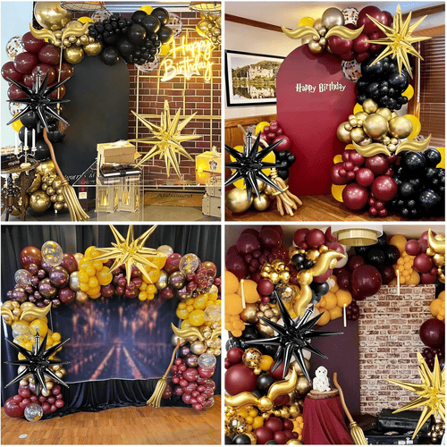 Balon iz lateksa v loku balonov na temo Harryja Potterja je narejen iz 100 % surovega lateksa, ki je uvožen iz jugovzhodne Azije. Ker so naravni materiali, so popolnoma okolju prijazni in neškodljivi za otroke in odrasle. Njihove barve so simbolične barve filmov o Harryju Potterju, vključno z vinsko rdečo, rumeno, črno in zlato. Za dodajanje več plasti smo dodali tudi konfetni balon, konfet je kovinsko zlat.