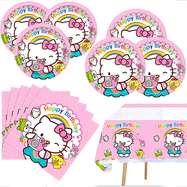 3) Namizna posoda: namizno posodo Hello Kitty lahko še vedno kombinirate z edinstveno vzorčastimi dizajni roza in belih kompletov za zabavo, da ustvarite ljubko vzdušje za vašo zabavo. Vsi izdelki so zelo trpežni, živih barv in na otip visoke kakovosti.