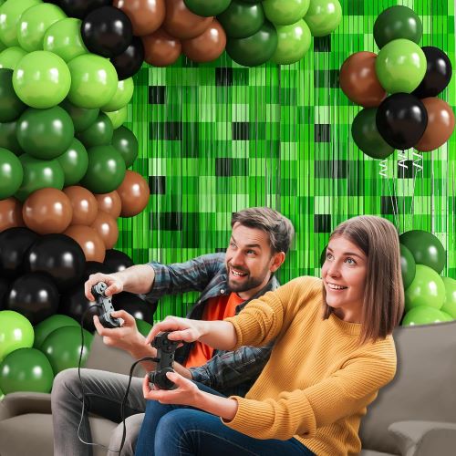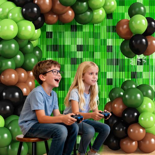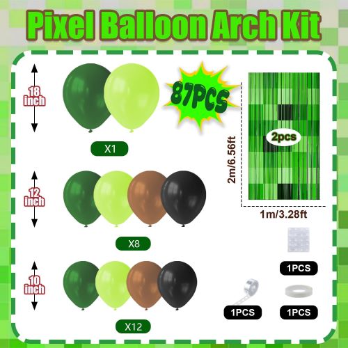 Navdihnjen z video igrami minecraft, ta trpežni komplet minecraft balon loka združuje različne odtenke zelenih pikselskih balonov z ozadji za zabave na temo minecraft, da ustvari igriv večplasten videz, ki ujame čar klasičnih pustolovskih iger.