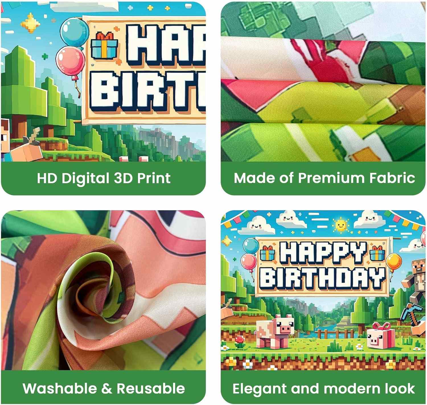 Minecraft papirnati transparenti kot glavno idejo vzamejo srečen rojstni dan. Črke in majhni deli imajo močan videz pik. Nekaj črk je narejenih iz oblik Stevea, Creeper, Enderman. Nekatere črke imajo TNT, diamant, piščanca. Vsak majhen del prikazuje slog igre v Minecraftu. Po obešanju transparent hitro prikaže temo zabave. Prostoru daje svetlega rojstnega dne.