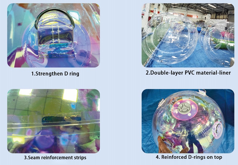 Dvojna struktura- napihljivazrcalna kroglaje sestavljen iz notranje obloge (0,4 mm PVC) in zunanje lupine (0,3 mm zrcalni material). Zaradi te strukture je mogoče večkratno uporabo izdelka večkrat napihniti in zagotavlja močno zračnost, kadar se uporablja v okolju nizkih in visokih temperatur.