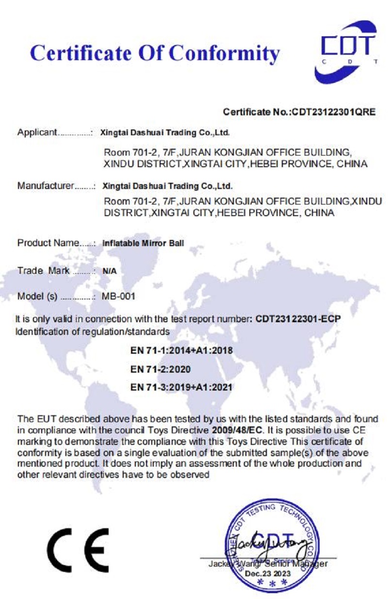 V glavnem narejen iz dvoslojnega trpežnega PVC materiala je površina posebej obdelana tako, da tvori zrcalni učinek, ki lahko odraža okoliško svetlobo in ustvari fantastičen vizualni učinek. Ta sfera ni le lahka, enostavna za prevoz in namestitev, ampak tudi trpežna in primerna za različna zunanja in notranja okolja. Poleg tega ima zrcalna kroglica različne barve in jo je mogoče prilagoditi z različnimi barvami ali vzorci glede na temo dogodka, da bi zadovoljili potrebe različnih strank.