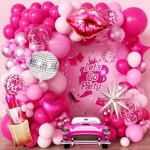 Kompleti vključujejo 5 in 12 in mat roza lateks balone, 5 in 12 in perla roza lateks balone, 5 in 12 in metalno roza lateks balone, 5 in 12 in bele lateks balone, 12 in roza konfete lateks balone, 18 in roza in belo srčkano folijo baloni, 18-palčni baloni iz folije v obliki zvezdic, roza zavesa iz folije, roza baloni iz folije Happy Birthday, okraski v obliki metuljev in dodatki, kot so lepilne pike, balonski trakovi in trakovi.