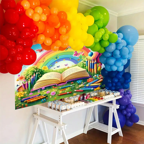 NuN čudovitoDekoracije za zabave na temo mavrice vključujejo sedem živahnih barv mavričnih balonov, ki vaši zabavi dodajo barvni pridih. S tem kompletom mavričnih balonskih lokov ustvarite živahen mavrični balonski lok, ozadje, osrednji del in vhod za vašo zabavo z mavrično temo.