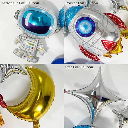 Baloni iz folije imajo astronavte, rakete, leteče krožnike in druge sloge, ki tej girlandi dodajo veliko zanimivosti in resničnosti.
