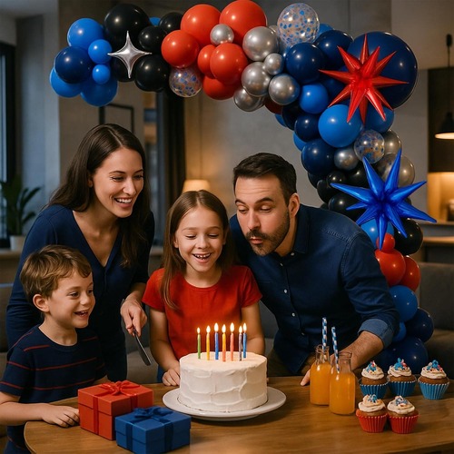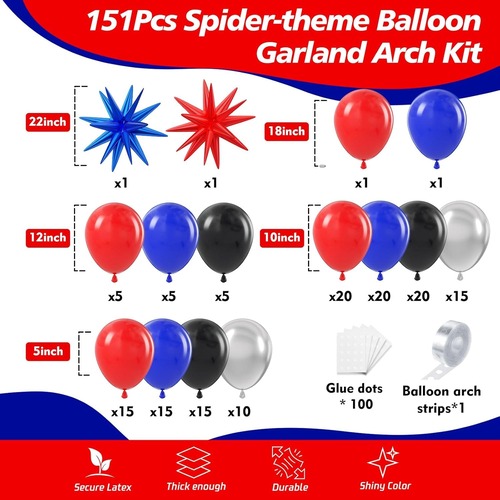 Glavne barve kompleta balonov so modra, rdeča in črna. Zaradi značilnih treh barv si boste predstavljali kul figuro Spider-Mana iz filma. Baloni iz lateksa v tem kompletu vključujejo mat rdeč balon, mat moder balon, mat črn balon in kovinski balon v traku. Balon iz folije v tem kompletu je balon iz folije v obliki zvezde eksplozije, modre in rdeče barve.