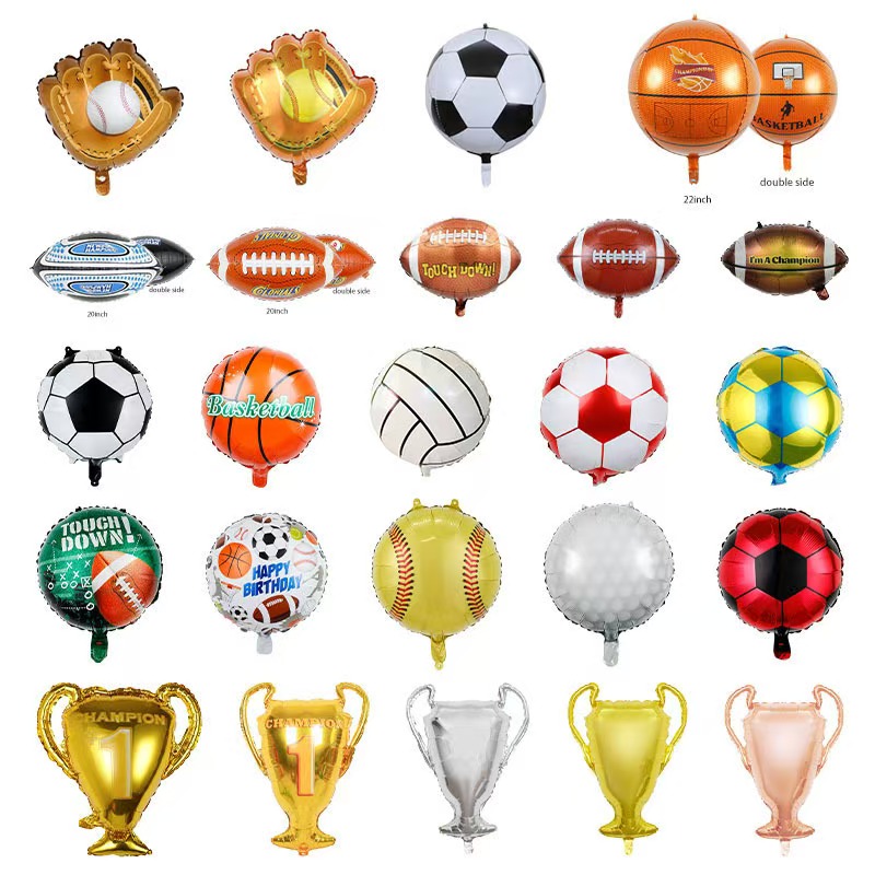 Dizajn zajema modeliranje športne opreme, košarko, nogomet, dumbbells, trofeje, silhuete športnih figur, "WIN", "GOAL" in "CHAMPION" in druge spodbudne črke. En sam balon velike velikosti (18–36 palcev) ne potrebuje zapletenega ujemanja in lahko postane vizualni poudarek, če ga obesite na sredino ali vhod v dejavnost. Posebej primeren je za prizore, kot so navijanje za velike dogodke, športne aktivnosti na prostem in športne igre v kampusu, ki takoj prebudijo navdušenje prizorišča.