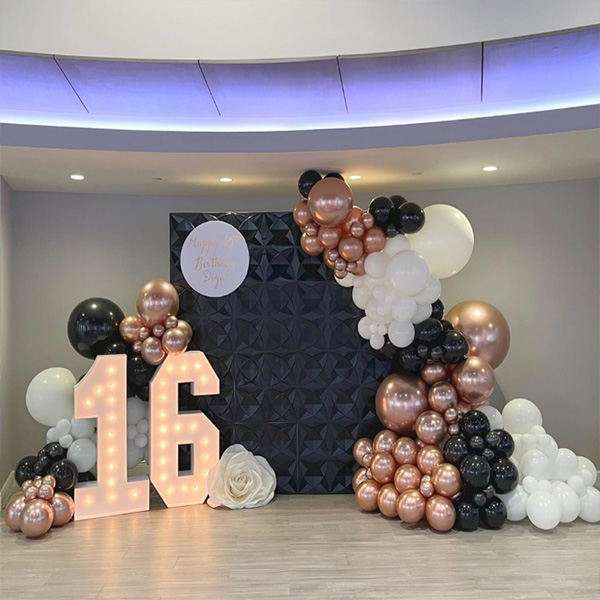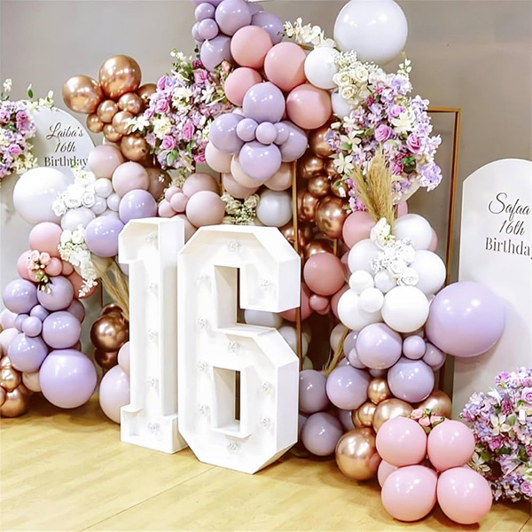 Girlanda iz balona s 16 led lučkami:Naša tovarna je na trg poslala tudi balonsko girlando s 16 let staro led lučko. LED številke so izdelane iz okolju prijaznih materialov ABS in LED za zagotavljanje svetlih in trajnih svetlobnih učinkov. LED luči s številkami in črkami, ki lahko svetijo v temi. Mehka osvetlitev ustvarja sproščeno in prijetno vzdušje ter vsakemu prostoru doda edinstven čar. Lahko jih razstavite samostojno ali obesite na steno, na kamin ali postavite v recepcijo za uporabo med dogodki ali praznovanji. LED lučke za številke z loki iz balonskih girland, primerne za ustvarjanje poglobljenega vzdušja zabave, so nepogrešljiv rekvizit za fotografiranje edinstvenih in nepozabnih fotografij, ki vašemu 16. rojstnemu dnevu dodajo nepozaben občutek slovesnosti.