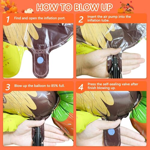 Balone iz folije za zahvalni dan bo zelo enostavno napihniti in zapreti. Za napihovanje lahko uporabite ročno ali električno črpalko, nato pa ga zalepite s samolepilnim lepilom, ki je na šobi vsakega balona. Ko bo balon zaprt, bo postal močan.